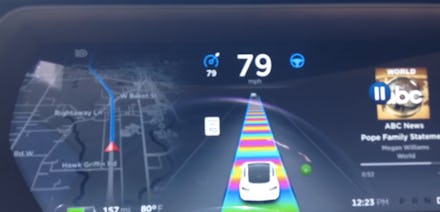 When one Tesla owner flipped on the autopilot feature, he saw the road on his car's console display turn from black to rainbow — a la the Rainbow Road level in Mario Kart 64.