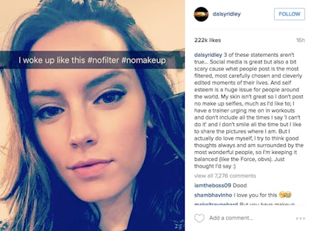 For all those perfectly coiffed, makeup-caked, airbrushed social media posts by people who profess to have just woken up, Star Wars' leading lady Daisy Ridley has a response. Ridley used Instagram on Monday night to send out a powerful message about social media, self-esteem and how the two relate to each other. "I woke up like this #NoFilter #NoMakeup," the star wrote across a photo of herself, which clearly featured a filter, makeup and someone who looked very awake.