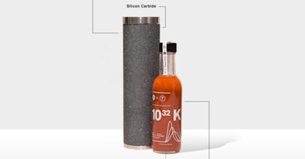 The hot sauce's name, 10^32K is a tongue-in-cheek reference to the Kelvin temperature of "Absolute Hot," the highest theorized temperature in contrast with "absolute zero." To protect the hot sauce, the Next Web writes that 10^32 Kelvin is packaged in a tube made with "silicon carbide and nickel-based superalloys, or what the company describes as materials used in jet engine manufacturing." But it's not all for show and weight: the material helps preserve the heat and taste of the sauce by preventing oxidization.