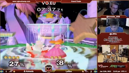 The tempo syncs up with the moves of Peach and Fox McCloud — while two gamers smash, tilt, attack and barrel roll around the Melee universe, the drummer freestyles to match with them.