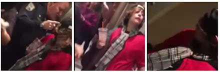 As the police escort the young woman out of the restroom, they tell her friends that you can "all leave if you want" to which one friend yells "We are leaving!" in response.