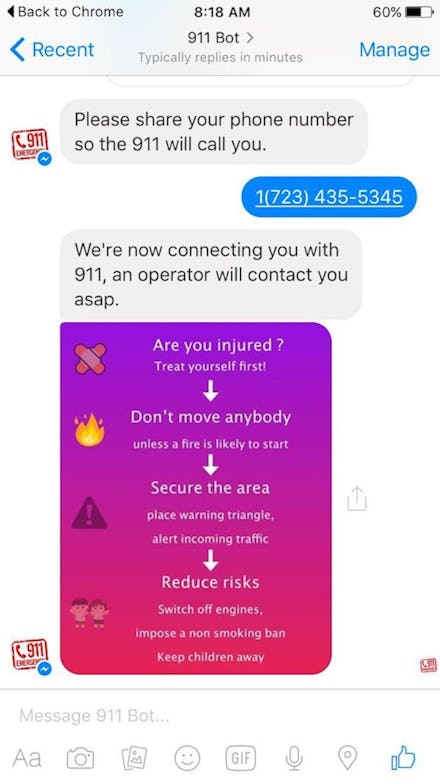 911bot, a Facebook Messenger-based chat bot built at TechCrunch's 2016 Disrupt Hackathon, seeks to make it easier for users to get in contact with the authorities faster via messaging rather than picking up the phone for a number of issues, from car accidents to shootings. "In emergencies, the most important thing is getting stuff done, and not waiting on the line," the creators of 911bot explained on Sunday.