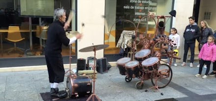 Enter Fuman Musicoloco, a musical clown, whose street act was recently caught on film in Zaragoza, Spain, and shared on Jose Enguita's Facebook. His website lists his skills as "juggling with clubs, balancing acts on rollers, balancing acts whilst juggling" in addition to "music." He makes his beats standing, throwing drum sticks at a rack of tom toms while juggling.