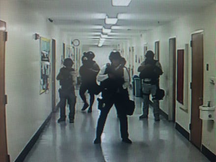 In a series of photos of security footage taken by Twitter user Kara Leung, the officers could be seen searching campus buildings, moving door-to-door with rifles and shotguns.