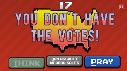 When you try to click on the tab "ban assault weapon sales," different signs appear in bold, declaring, "That's un-American!" "You rely on NRA donations!" "You don't have the votes!" and "Weak!"