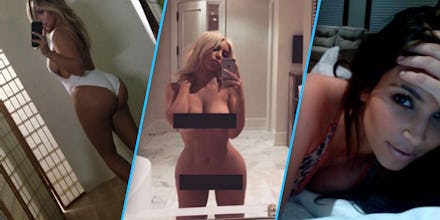 This mirror selfie from 2013 is so iconic that it became its own Kimoji. While it may not appear to fulfill all of Kim's requirements at first glance, when you consider that the primary subject of photo is Kim's ass and not her face, you'll notice that it excels: The lighting is moody, the angle is creative, the camera is facing downward (at her butt) and the absence of visible duck face is more than made up for by the addition of her stellar side-boob.