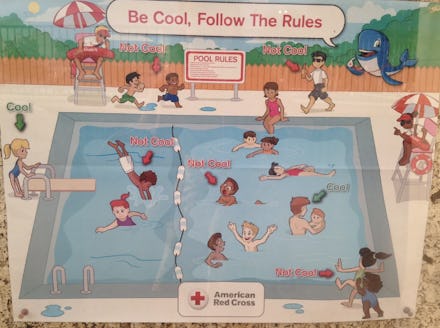 A blonde girl climbing onto the diving board is labeled "cool" but the brown boy jumping off it is "not cool." The white man playing with a baby in the water is "cool" but the brown boy swimming with his mouth open is, for some reason, "not cool." The poster even shows what appears to be a black girl pushing a white girl into the water. To many viewers, the implication seemed to be that all the kids of color are rule-breaking troublemakers.