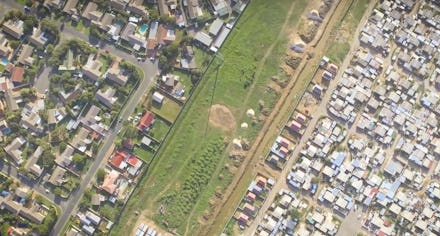 In the video, Strand is defined by a series of nice and clean houses with large backyards. Right across the buffer zone are Nomzamo's notably small tin shacks that are surrounded by drainage ditches rather than lush yards.