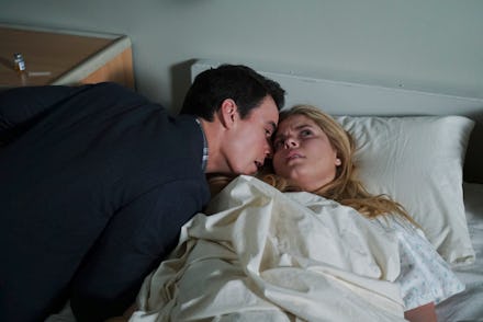 When they return, the girls realize Elliott has taken Ali from Welby, but she's managed to send them her location from her phone. Ali pushes Elliott as he drives, forcing the car into a skid and a stop. He chases her on foot down the rural dirt road — the same road the other girls are barreling down in their search for Ali. She just barely misses getting hit, while Elliott goes face first through the windshield, his bloody face hanging directly in Hanna's. Talk about poetic justice.