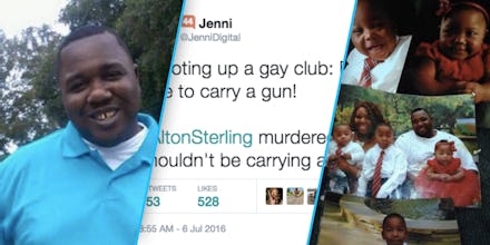 Twitter user @JenniDigital called out the hypocrisy exposed by these responses in one powerful tweet Wednesday. "Shooting up a gay club: Everybody should be able to carry a gun!," Jenni wrote. "Alton Sterling murdered by cop: Welp, he shouldn't be carrying a gun!"