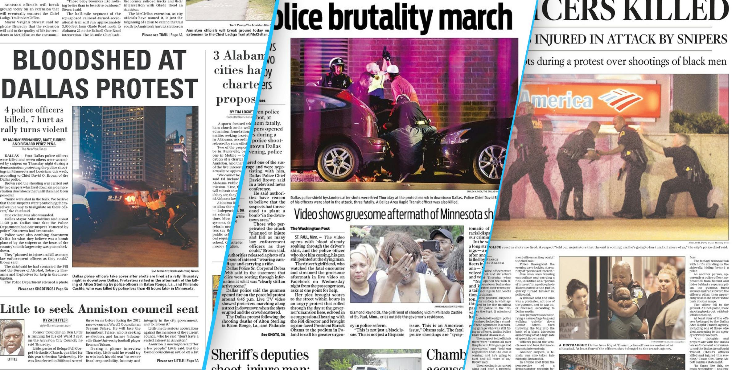 In Wake of the Dallas Shooting, We Can Look to the Nation's Front Pages — Or Beyond themImpactBy Jessica EggertJuly 8, 2016There's a familiar scene unfolding across America's newsstands today. NewseumIts started in the hours following Thursday night's massacre at a Black Lives Matter protest in Dallas.NewseumTragedies were immediately inked onto the front pages of nation's our biggest newspapers. Newseum"Slain." "Bloodshed." "Killed."But amidst these tragedies, we can choose the story we remember about senseless violence in America.NewseumWe can look to the front pages — or look beyond them.NewseumWe can fixate on violence — or identify love. NewseumWhile each tragedy can showcases the worst of people ...Newseum... it also unearths the best.TwitterLike when Muslims broke their holy fast to donate blood for Orlando, Florida, victims.Like when these police officers posed in solidarity with these Black Lives Matter protestor.TwitterLike when these two Black Lives Matter activists got married in Ferguson, Missouri.TwitterLike when white people took a stand for black lives.Alex Brandon/APOur nation's history reflects the stories we tell ourselves. And the stories we read from others. It's up to us to choose them.