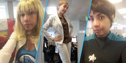 So far, Rivas has posted nearly 20 photos of herself in full-on costume and her Facebook post has been shared more than 20,000 times, with commenters applauding her creativity. "I hope the powers that be get knocked down a peg or two," one commenter wrote. Another: "I love this so much. FIGHT THE SYSTEM OF OFFICE CLOTHING."