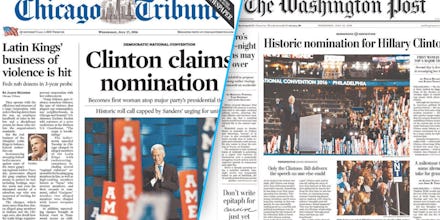 Headlines on front pages declared "Historic Nomination" (The Washington Post) and "Change Maker" (Arizona Republic). But photos beneath these headlines showed Bill Clinton waving to the crowd assembled for the second night of the 2016 Democratic National Convention in Philadelphia. In some of the more unfortunate pairings, headlines like "Clinton Claims Nomination" in the Chicago Tribune and "Clinton Makes History" in the Houston Chronicle featured Bill Clinton. Hillary Clinton is nowhere to be found.