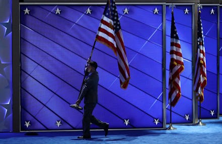 And, for anyone still doubting whether the DNC cared to add flags only after complaints, here's a still from the convention's opening Monday afternoon, showing Philadelphia teen Bobby Hill singing the national anthem surrounded by flag imagery. The flags at the Republican National Convention, like the ones seen below, were also a digital display (as seen in speakers' different backdrops here and here.)