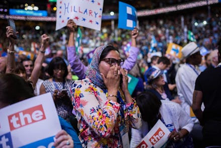 The Hillary Clinton campaign tweeted a photo of a Muslim woman weeping and celebrating her nomination on the third night of the 2016 Democratic National Convention. The campaign tweeted a caption that read: "We made history."