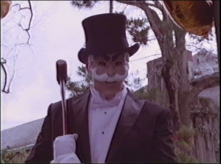 Then, an unknown person (the film hints it could be their uncle who supposedly committed suicide) takes the "un-chic" Monopoly mask one of the kids leaves out on the table, and the careful massacre begins when he approaches one of them as they fiddle with the stereo. As expected from a slasher film, there's a ton of blood.