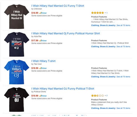 The Daily Dot reported on Friday that several outlets on Amazon were selling t-shirts bearing the phrase, "I wish Hillary had married OJ." "OJ" is shorthand for Orenthal James Simpson, or O.J. Simpson, the famed footballer who was notoriously acquitted of murdering his wife in criminal court, though he was later found liable for her death and had to pay his wife's family $33.5 million.