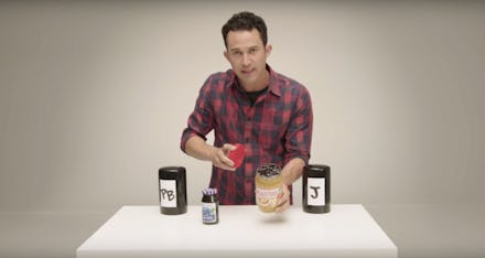 "What's that, peanut butter?" he asks the jar. "You say you're actually jelly? Whoa. And jelly, you're actually peanut butter?"