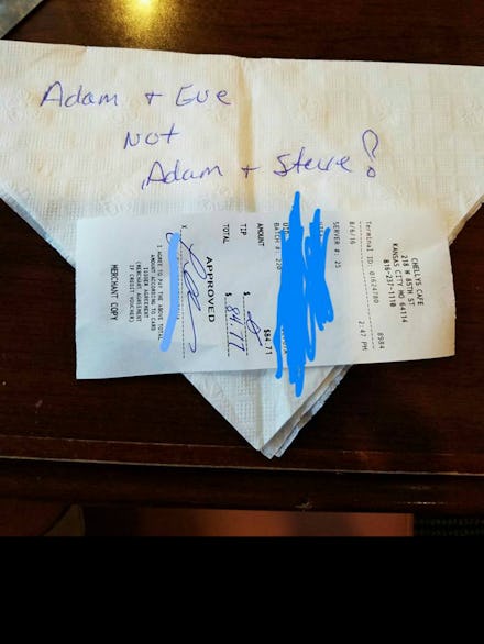 That wasn't the case for Kansas City, Missouri, waiter Eduardo Cabrera, who didn't get a tip from a Chelly's Cafe patron but instead received a note that said, "Adam and Eve, not Adam and Steve."