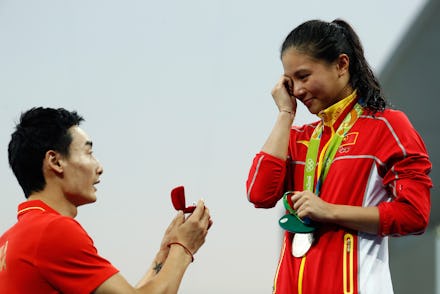 Chinese diver He Zi was awarded all of this and more on Sunday at the Rio Olympics. After winning the silver in the Women's diving 3-meter Springboard Final, He's boyfriend Qin Xai did that whole down-on-one-knee thing and popped the question. You can watch it play out below: