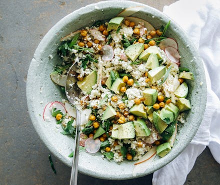 If you haven't tried cauliflower rice yet, come on and join the party. The grain-free rice substitute is super easy to make — just pulse cauliflower in a food processor until it's reached the consistency of rice grains, or couscous, if you prefer. You can also grab a bag of pre-made "riced cauliflower" at Trader Joe's, if you're feeling lazy.