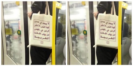 In a Berlin metro car, a woman was spotted wearing a tote bag with Arabic lettering scrawled in print within a boxed frame. The Arabic lettering isn't a pledge of allegiance to some religious extremist group. In fact, the translation is quite tongue-in-cheek: "This text has no other purpose than to terrify those who are afraid of the Arabic language."