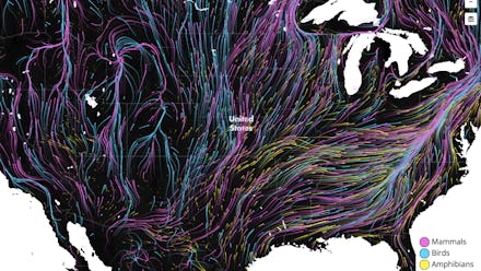 Scientists who worked on the research created a moving map of the forced migrations that could happen in the future. The map tracks the movement of mammals (purple), birds (blue) and amphibians (yellow). Though the time scale is still uncertain, as ecologist Dan Majka told Wired, here's what part of the U.S. and Canada may look like in the future.