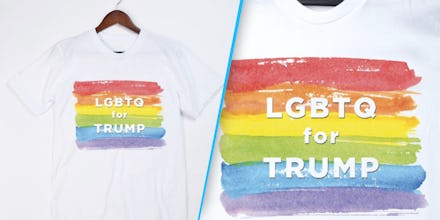 And now, just recently, you can buy a white T-shirt that reads "LGBTQ for Trump" over a shoddily-painted rainbow flag.