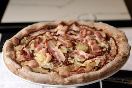 The chocolate pizza crust is then topped with two kinds of cheese (mozzarella and gorgonzola), caramelized onions, fig puree and plenty of bacon. The pie gets a second dose of chocolate flavor from a sprinkle of cacao nibs on top. The result is a sweet and salty dish with hints of deep chocolate flavor.