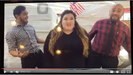 In the ad, which has since been deleted from the page, store manager Cherise Bonanno and two employees stand in front stacks of mattresses just before Bonanno pushes the other workers into the "towers" causing them to fall.