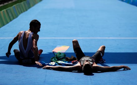 The British triathlete was closing in on the finish line in first place when he began to stumble, staggering across the course into the arms of an official who caught him from falling. But as his opponent Henri Schoeman blew by, Johnny's brother Alistair — who, according to the Guardian, had been holding steady in third place — put an arm around Johnny, running alongside him for the final meters of the race.