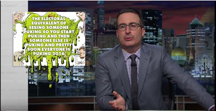 Ahead of the first presidential debate Monday night, John Oliver returned from a brief hiatus to HBO's Last Week Tonight to compare the presidential candidates' respective scandals. Oliver prefaced that it's a tough election this year, referring to it as "the electoral equivalent of seeing someone puking so you start puking and then someone else is puking and pretty soon everyone is puking 2016."