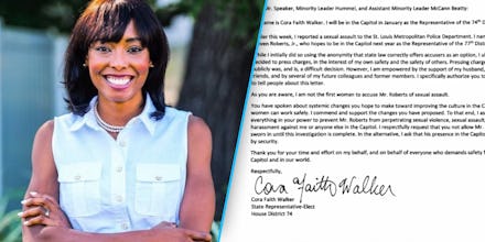 Both he and Walker are running uncontested for their seats in the Missouri House and are expected to be sworn in in January. In her letter, Walker asked that Roberts not be instated until the police have finished investigating her case and that — with an eye to the "systemic changes" necessary to reform the legislature's female-unfriendly environment — they "do everything in [their] power to prevent Mr. Roberts from perpetrating sexual violence, sexual assault, or sexual harassment against me or anyone else in the Capitol."