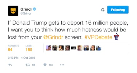 "If Donald Trump gets to deport 16 million people, I want you to think how much hotness would be lost from your @Grindr screen. #VPDebate," the tweet read.