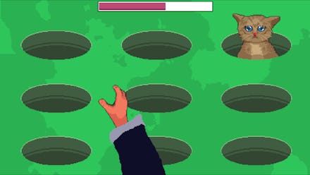 The game is called Trump's Pussy Grabber. It's like Whac-A-Mole, only instead of a mallet and burrowing creatures, you're equipped with orange-tinted baby hands to grab at mewling cats.