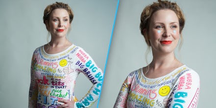At first, she thought about merely painting the statements onto a canvas, but then thought of a more creative approach. Why not paint the comments on a dress, so people can see the comments people have made about her body on those body parts?