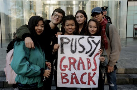 Women of all ages — and some men, too — dressed in black, and according to Jezebel, chanted "Donald thinks he runs this town, pussy came to shut it down!" They also shouted "GOP, hands off me!"
