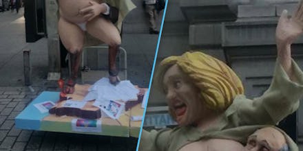 The statue is slightly similar in tone to the unrelated series of naked sculptures of Donald Trump that popped up in cities across the country back in August. But Scioli's depiction of Clinton featured what appear to the bloodied legs of a goat — a symbol linked to the devil. It's arguably a step further than sculpting a nude Trump with a small penis.