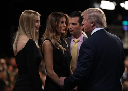 At the third and final debate, held at the University of Nevada, Las Vegas, Trump aligned herself with her husband's running mate, Hillary Clinton (sartorially, at least) by wearing Clinton's go-to designer, Ralph Lauren. Trump opted for a $1,790 all black "Sheryl tie-front jumpsuit" with a prominent pussy bow proudly on display.