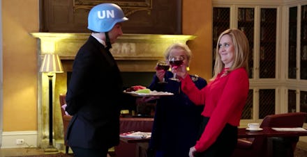 So to get an idea of what Clinton could face if she is elected, Full Frontal host Samantha Bee went to the United Nations to talk with prominent "nasty women" politicians, starting with former Secretary of State Madeleine Albright. Albright led Bee to what appeared to be a woman's bathroom, only for it to reveal itself as a secret lounge complete with bookshelves and prompt maître d' service from UN lackeys.