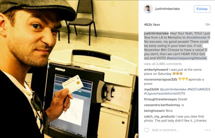 However, the selfie in question is no ordinary snap. It was taken Monday in a Tennessee voting booth in Justin Timberlake's hometown. "Hey! You! Yeah, YOU!" he wrote in the selfie's caption. "I just flew from L.A. to Memphis to #rockthevote !!! No excuses, my good people!"