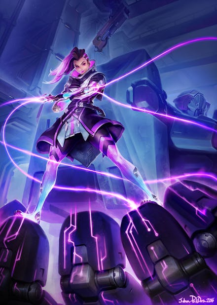 A Google search of name signed on the image of Sombra, John Polidora, will bring up the LinkedIn and ArtStation profiles for a Blizzard concept artist and character designer.