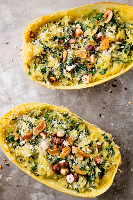 Garlicky brown butter spaghetti squash with greens and hazelnuts