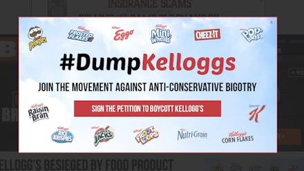 Visitors of the Breitbart site are even greeted with a pop-up notification that calls for a boycott of Kellogg's products.
