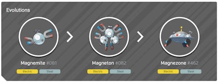 Pokémon fans should also be familiar with Magneton, the evolution of Magnemite that looks like three of the little fellas stuck together — you know, because they're magnets.