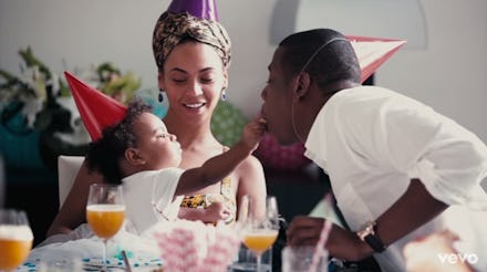 The music video ends with footage of the family at a birthday party, complete with paper hats and Blue feeding her dad a piece of cake (clearly an ongoing theme). And in a moment that is too cute for words, we get to see Jay Z and Blue play with a football in an empty stadium, before one of Mom's Super Bowl performances.