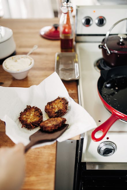"A twice-fried latke is extra nice, so if you'd like to make these ahead of time, store them in the refrigerator and then reheat by frying them again," Yeh suggests.