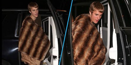Over the weekend, Justin Bieber stepped out in West Hollywood draped in what looks like a very luxe, cozy brown blanket. He draped it over one shoulder, as if he was a caveman living in a prehistoric era.