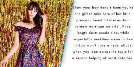 "Show your boyfriend's mum you're the girl to take care of her little prince in beautiful dresses that scream marriage material," the email reads. "Knee length skirts exude class while respectable necklines mean Father-in-Law won't have a heart attack when you lean across the table for a second helping of roast potatoes."