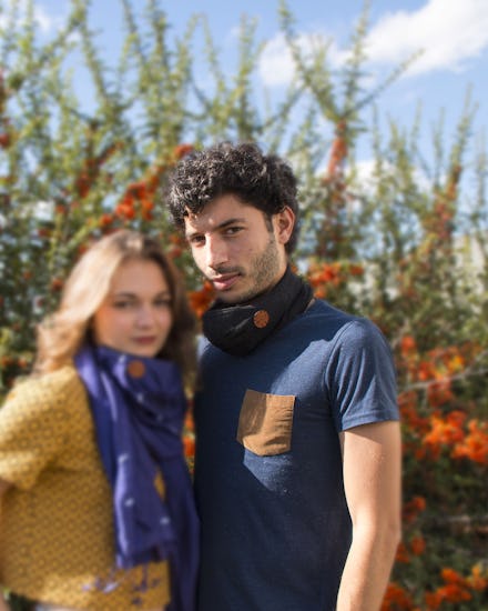 The company's product line ranges from black neck tubes to wrap-around scarves and retails between around $56 and $91.